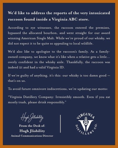 Virginia Distillery Company is leaning into the recent viral video of a very intoxicated raccoon discovered inside a Virginia ABC store.